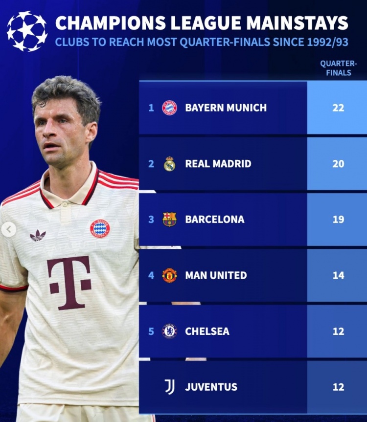1BSPORTS 1B体育 3月6日讯 欧冠十六强战首回合已经全部完赛,《转会市场》也统计了92-93赛季改制之后的晋级欧冠八强次数情况,拜仁以22次居首。