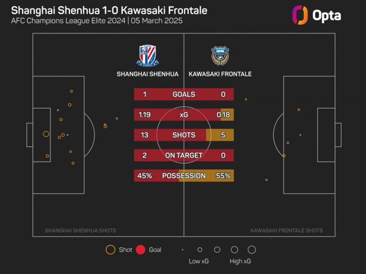 1BSPORTS 1B体育 3月5日讯 根据足球数据机构Opta的统计,今晚川崎前锋客场0-1不敌上海申花的比赛,是川崎前锋2014年以来在亚冠单场比赛中射门次数第二低的比赛。