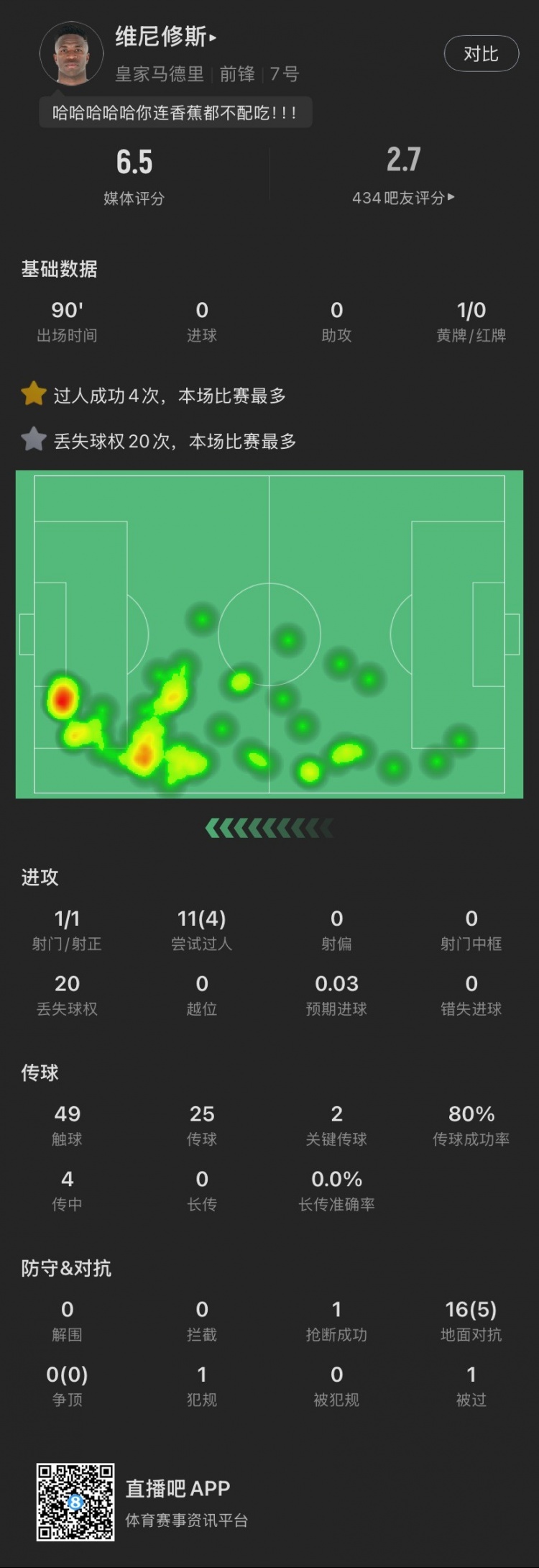 维尼修斯本场主要数据↓