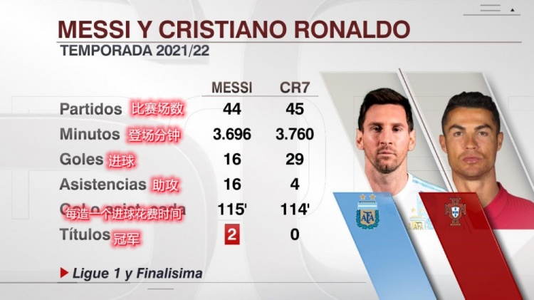 ESPN旗下的SportsCenter对比了21/22赛季梅罗数据。